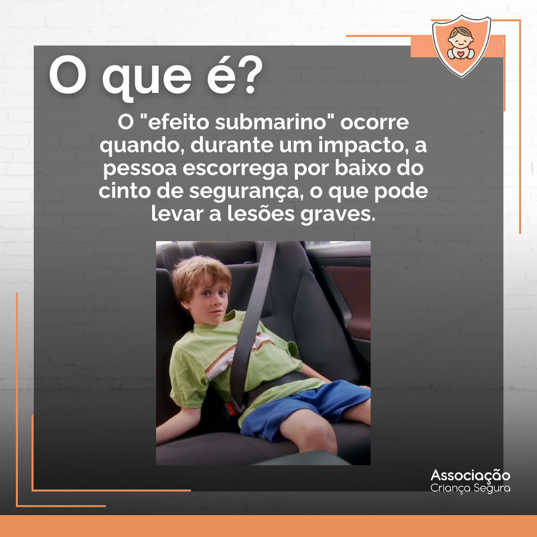 O "efeito submarino" ocorre quando, durante um impacto, a pessoa escorrega por baixo do cinto de segurança, o que pode levar a lesões graves. Este fenómeno é geralmente mais observado quando o cinto não está devidamente ajustado ou posicionado sobre a pélvis, ou quando a cadeira não é adequada ao tamanho da criança.