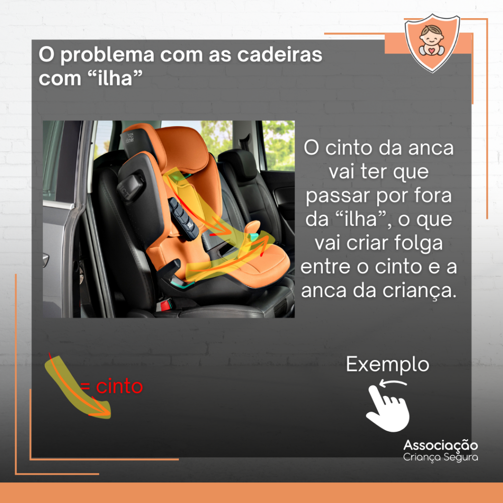 O problema ocorre nestas cadeiras quando percebemos que o cinto, que devia estar a reter a anca da criança, está na verdade a dar uma volta pela "ilha" da cadeira. Esta volta, mesmo que pareça pequena, cria então uma folga no cinto, gerando exactamente o problema que estas cadeiras tentam resolver. Ao criar mais área entre a anca e o cinto, estamos a produzir o mesmo efeito que queremos evitar quando não queremos crianças com casacos grossos nas cadeiras auto, pois estamos a criar espaço entre o cinto e o corpo.